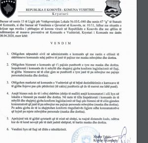 Asnjë biznes nuk do të i ofroj shërbim (shitje të mallit) asnjë konsumatori i cili hyn në lokalin e biznesit pa maskë dhe dorëza. Në raste të tilla Inspektorati i komunës do të mbyllë dhe shqiptoj gjoba konform legjislacionit në fuqi çdo biznesi në të cilin gjenden konsumatorë që janë të pa mbrojtur me pajisje personale mbrojtëse (maska dhe dorëza). Po ashtu gjoba do të iu shqiptohen konform rregullativës ligjore edhe konsumatorëve që hyjnë pa mjete mbrojtëse personale (maska dhe dorëza).