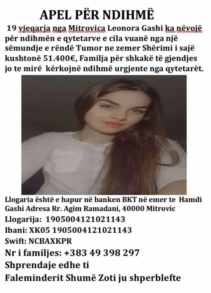 19 vjeçarja nga Mitrovica, Leonora Gashi, ka nevojë për ndihmë pasi vuan nga një sëmundje e rëndë.