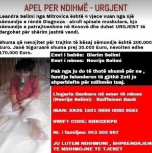 4-vjeçarja vuan nga një sëmundje, diagnoza e quajtur ATROFI SPINALE MUSKULARE, sëmundje e patrajtueshme në Kosovë.