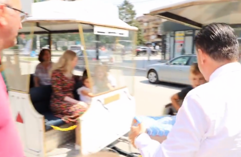 Kryetari i Mitrovicës është parë derisa iu shërben lëngje disa fëmijëve në Mitrovicë.