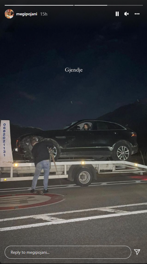 Megi shihet në makinë teksa vetura e saj bartet me marimangë. Në pjesë e përparme të makinës shihet vetura e saj ku shihet që ajo ka pësuar një aksident të vogël.