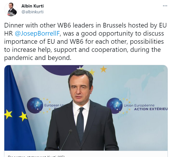 “Darka me udhëheqësit e tjerë të Ballkanit Perëndimor në Bruksel të organizuar nga Josep Borrell, ishte një mundësi e mirë për të diskutuar rëndësinë e BE-së dhe Ballkanit Perëndimor për njëri-tjetrin, mundësitë për ta rritur ndihmën, mbështetjen dhe bashkëpunimin, gjatë pandemisë dhe më gjerë”, shkroi Kurti.
