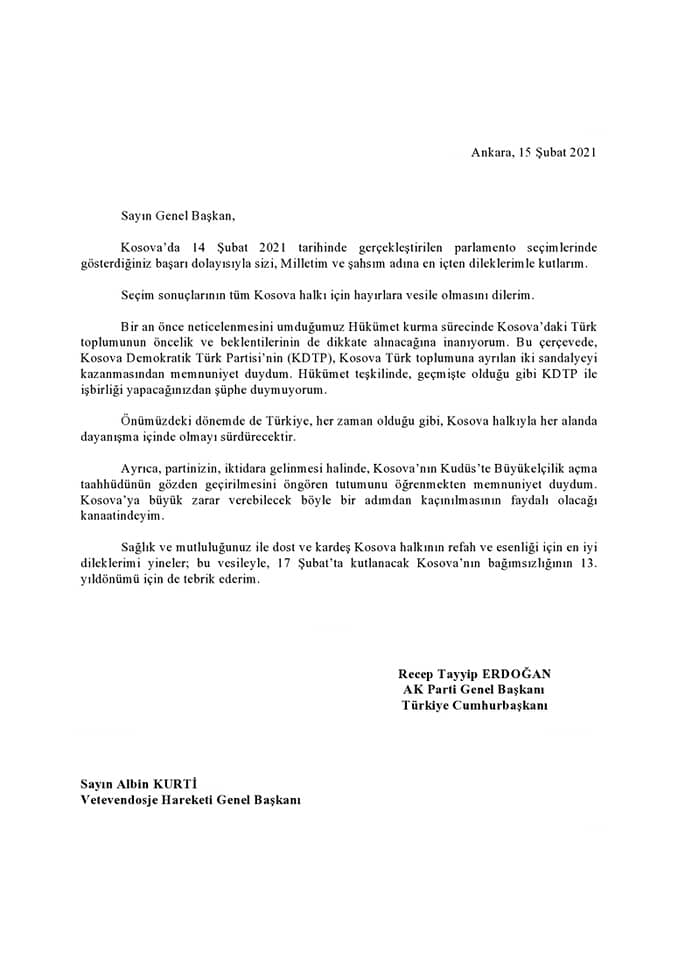 “Për më tepër, jam i kënaqur, kur mësova për qëndrimin e partisë suaj që, nëse vjen në pushtet, do ta rishikojë angazhimin e Kosovës për hapjen e Ambasadës në Jerusalem. Besoj se do të ishte e dobishme që të shmangej një hap të tillë, i cili mund t’i shkaktonte dëme të mëdha Kosovës”, ka shkruar Erdogani në letrën e tij.