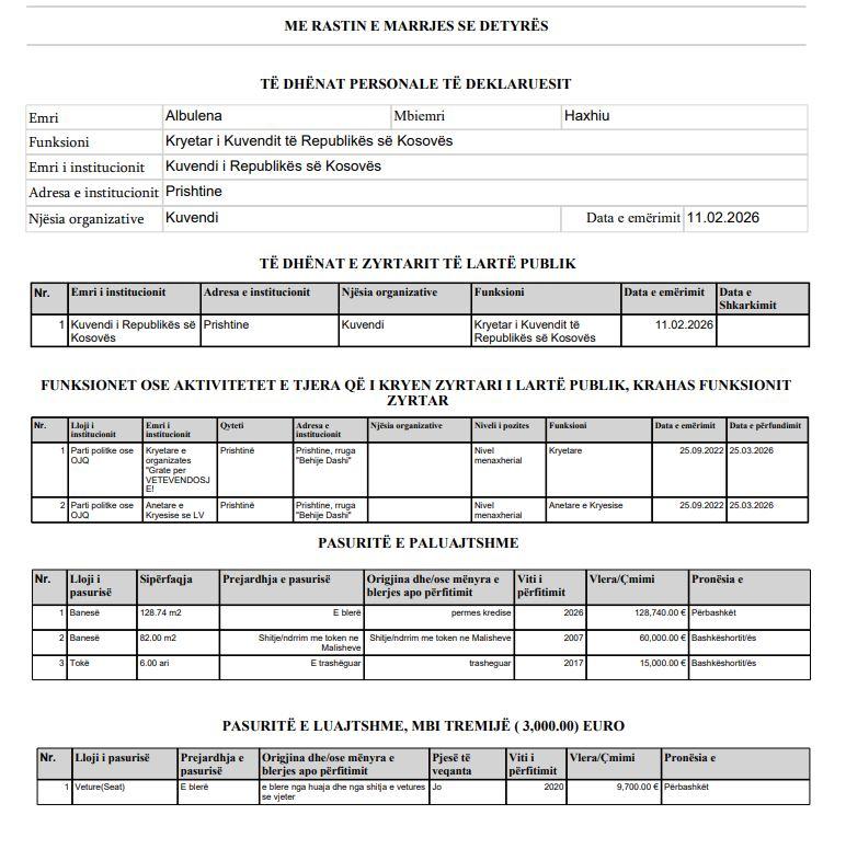 Hyni Mirë se vini! Hyni në llogarinë tuaj Emri i përdoruesit tuaj fjalëkalimi juaj Forgot your password? Get help Krijo nje llogari Krijo nje llogari Mirëpritur! regjistrohuni për një llogari emaili juaj Emri i përdoruesit tuaj Një fjalëkalim do t'ju dërgohet në email Shërim fjalëkalimin Rikupero fjalëkalimin emaili juaj Një fjalëkalim do t'ju dërgohet në email LAJME Albulena Haxhiu blenë banesë mbi 128 mijë euro: Përmes kredisë 17 Prill, 2026 - 13:00 17 Prill, 2026 - 13:00 By MitrovicaSot Shpërndaje FacebookTwitterPinterestWhatsApp Kryetarja e Kuvendit, Albulena Haxhiu, ka blerë banesë mbi 128 mijë euro. Kështu thuhet në Agjencinë për Parandalimin e Korrupsionit, raportin e deklarimit të pasurisë. Haxhiu ka thënë se këtë e ka blerë me kredi. Shpërndaje FacebookTwitterPinterestWhatsApp TË FUNDIT Irani rihap Ngushticën e Hormuzit, rikthehet lëvizja e anijeve tregtare MitrovicaSot - 17 Prill, 2026 - 14:30 Nufi: S’ka ndryshim në planet e KFOR-it për Kosovën MitrovicaSot - 17 Prill, 2026 - 13:45 Kurtit i shtrenjtohet qiraja e shtëpisë, mbetet me 16.41 centë në bankë – kjo është pasuria që deklaroi në APK MitrovicaSot - 17 Prill, 2026 - 12:06 Kadriaj ironizon: VV e ka çliru Mitrovicën duke i pranu strukturat e Serbisë, e pranuan Zajednicën e ia falën 10 hektarë Manastirit MitrovicaSot - 17 Prill, 2026 - 11:37 TË FUNDIT Irani rihap Ngushticën e Hormuzit, rikthehet lëvizja e anijeve tregtare 17 Prill, 2026 - 14:30 Nufi: S’ka ndryshim në planet e KFOR-it për Kosovën 17 Prill, 2026 - 13:45 Kurtit i shtrenjtohet qiraja e shtëpisë, mbetet me 16.41 centë në bankë – kjo është pasuria që deklaroi në APK 17 Prill, 2026 - 12:06 Kadriaj ironizon: VV e ka çliru Mitrovicën duke i pranu strukturat e Serbisë, e pranuan Zajednicën e ia falën 10 hektarë Manastirit 17 Prill, 2026 - 11:37
