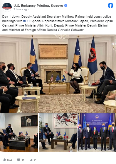 “Dita 1: Zëvendësndihmës Sekretari Matthew Palmer zhvilloi takime konstruktive me Përfaqësuesin Special të BE-së Miroslav Lajcak, presidenten Vjosa Osmani, kryeministrin Albin Kurti, zëvendës kryeministrin Besnik Bislimi dhe ministren e Punëve të Jashtme Donika Gervalla-Schwarz”, shkruan Ambasada amerikane në Facebook.
