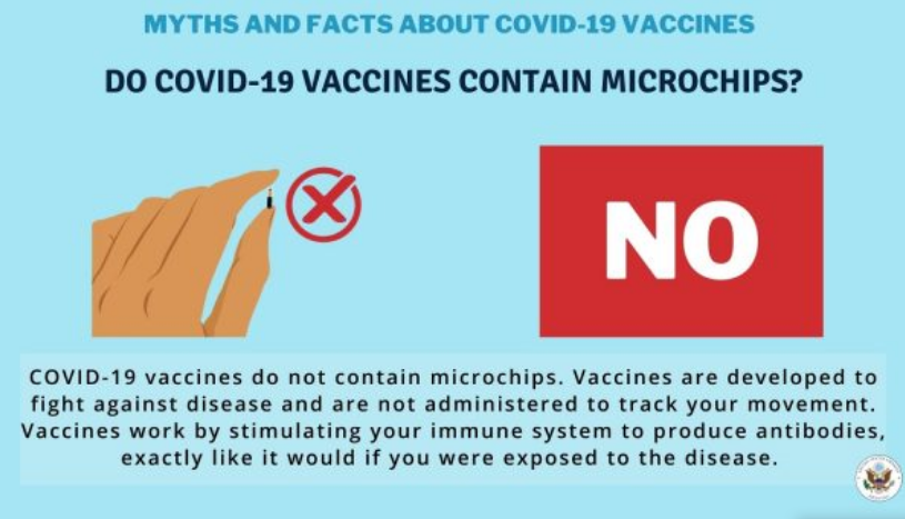 Ambasada e Amerikës në Prishtinë ka dalur me një njoftim për vaksinat Anti-COVID dhe deklaratat se ato përmbajnë mikroçipa. Nga kjo Ambasadë kanë thënë se vaksinat kundër COVID-19 nuk përmbajnë mikroçipa dhe se ato janë zhvilluar për të luftuar sëmundjet.