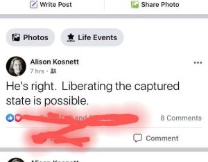 Fillimisht në profilin e saj në Facebook, Alison Kosnett, ka shkruar për shtetin e kapur pa përmendur emrin e Kurtit.