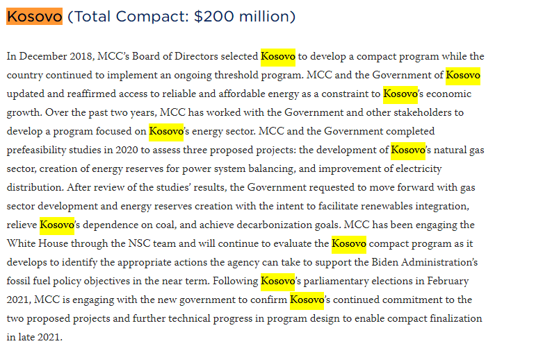 “MCC dhe Qeveria përfunduan studimet në vitin 2020 për të vlerësuar tre projekte të propozuara: zhvillimin e sektorit të gazit natyror të Kosovës, krijimin e rezervave të energjisë për balancimin e sistemit të energjisë dhe përmirësimin e shpërndarjes së energjisë elektrike. Pas rishikimit të rezultateve të studimeve, Qeveria kërkoi të shkojë përpara me zhvillimin e sektorit të gazit dhe krijimin e rezervave të energjisë me synimin për të lehtësuar integrimin e burimeve të rinovueshme, lehtësimin e varësisë së Kosovës nga qymyri dhe arritjen e qëllimeve të dekarbonizimit”, thuhet në dokument.