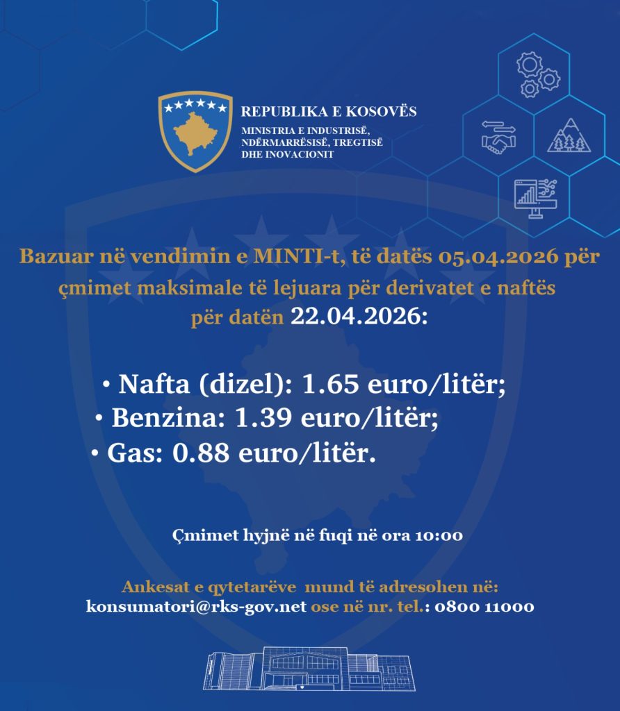 Ministria e Industrisë, Ndërmarrësisë, Tregtisë dhe Inovacionit ka publikuar çmimet e derivateve për sot.