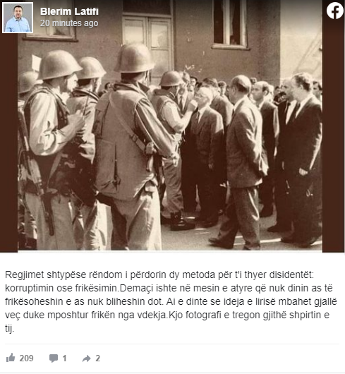 “Regjimet shtypëse rëndom i përdorin dy metoda për t’i thyer disidentët: korruptimin ose frikësimin. Demaçi ishte në mesin e atyre që nuk dinin as të frikësoheshin e as nuk bliheshin dot. Ai e dinte se ideja e lirisë mbahet gjallë veç duke mposhtur frikën nga vdekja. Kjo fotografi e tregon gjithë shpirtin e tij”, ka shkruar Latifi në Facebook.