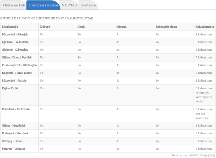 Rruga Pejë- Kullë vazhdon të jetë e kalueshme vetëm për automjete të vogla, ndërsa Prishtinë- Mutivodë e kalueshme por me vështirësi.