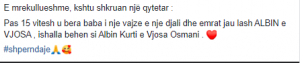 “Pas 15 vitesh u bëra baba i një vajze e një djali dhe emrat jau lash ALBIN e VJOSA , ishalla bëhen si Albin Kurti e Vjosa Osmani. Qofshin me jetë të gjatë e të lumtur Vjosa e Albini”, thuhet në postimin e shpërndarë në grupin “me Kryeministrin”