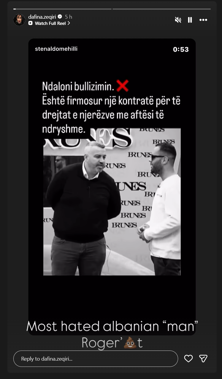 Pjesa që ka tërhequr më së shumti vëmendje është shënimi bashkangjitur postimit në Instastory, ku këngëtarja nuk është kursyer aspak me fjalët drejtuar Rogertit. Ajo e ka cilësuar atë si “mashkullin” më të urryer shqiptar, duke përdorur thonjëzat për të theksuar zhgënjimin e saj mbi veprimet e tij. Krahas kësaj, ironia e saj ka vijuar me përdorimin e një emoji ofendues në emrin e tij, duke shprehur kështu hapur indinjatën për akuzat e rënda që Rogerti i bëri Stenaldos kohë më parë rreth shikimit dhe akuzave për viktimizim.