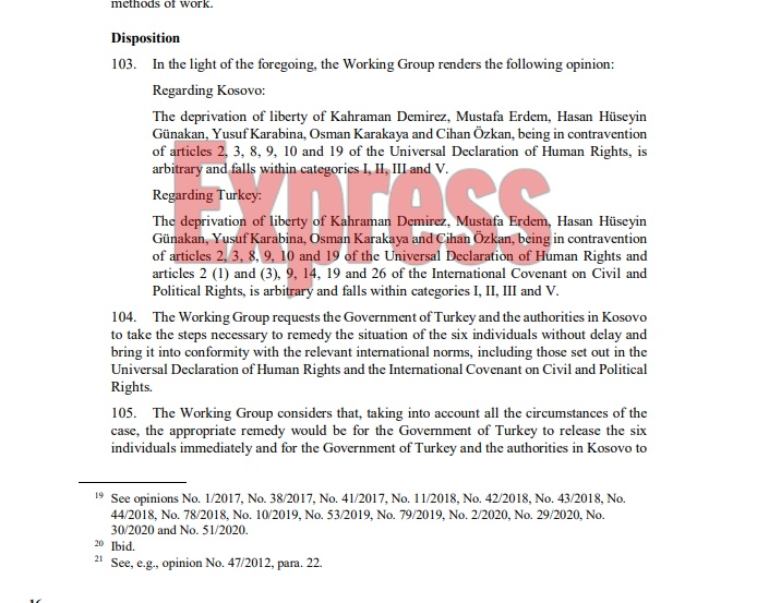 “Grupi i Punës jep mendimin vijues: Lidhur me Kosovën: Heqja e lirisë së Kahraman Demirez, Mustafa Erdem, Hasan HüseyinGünakan, Yusuf Karabina, Osman Karakaya dhe Cihan kanzkan, duke qenë në kundërshtim të neneve 2, 3, 8, 9, 10 dhe 19 të Deklaratës Universale të të Drejtave të Njeriut, është arbitrar dhe hyn në kategoritë I, II, III dhe V”, thuhet në raportin 17 faqesh.