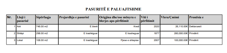 Gjyshnica ka deklaruar se posedon një arë në pronësi me vlerë 26 mijë e 110 euro, si dhe një shtëpi me vlerë 280 mijë euro dhe një lokal me vlerë 100 mijë euro, ku këto dy të fundit janë në pronësi të prindërit.