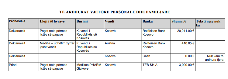 Ai gjithashtu ka deklaruar pagën e prindit të cilën e merr nga Medikos pharm Gjakovë ne vlerë 3 mijë euro.