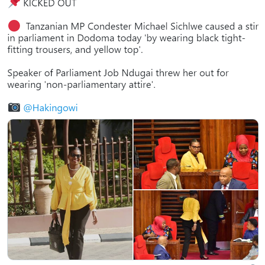 Një incident është regjistruar gjatë një seance parlamentare në Tanzani. Një deputete është nxjerrë jashtë Parlamentit për shkak të pantallonave të saj të ngushta. Lidhur me rastin, një nga deputetët është shprehur se mënyra se si visheshin disa gra është tallje në parlament.