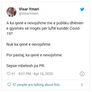 “A ka qenë e nevojshme me e publiku dhënien e gjysmës së rrogës për luftë kundër Covid-19? Nuk ka qenë e nevojshme. Por pastaj, ka qenë e nevojshme. Sepse mbetesh pa PR”, ka shkruar Ymeri.