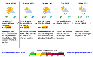 Temperaturat minimale do të lëvizin ndërmjet -2 deri 2 gradë Celsius, ndërsa maksimalet e ditës parashihen të lëvizin ndërmjet 8-11 gradë Celsius.