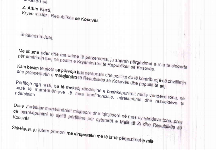 Në këtë letër, Abazoviqi po ashtu ka thënë se e ka besimin e plotë që përvoja personale dhe politike e Kurtit do të kontribuojë në zhvillimin dhe prosperitin e mëtejshëm të Republikës së Kosovës dhe popullit të saj.