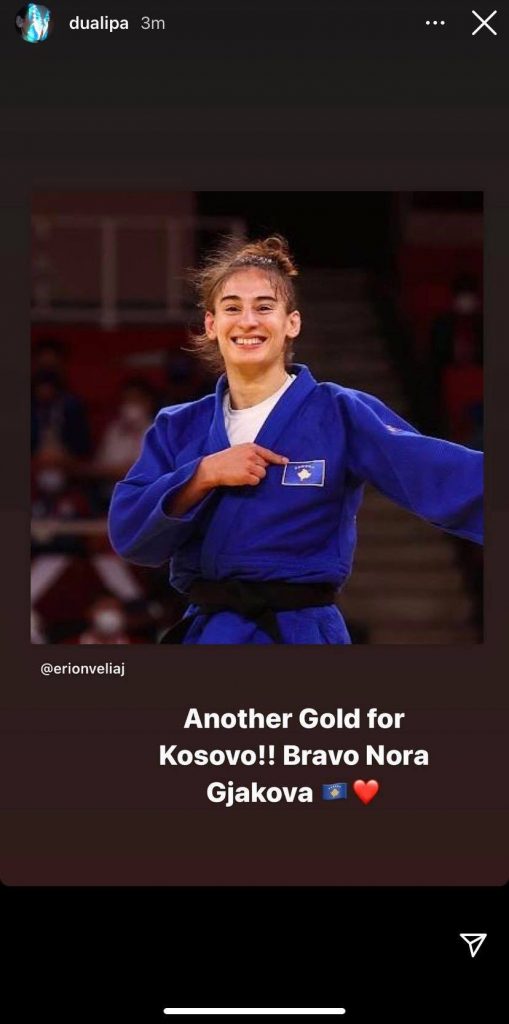 “Edhe një medalje e artë për Kosovën!! Bravo Nora Gjakova”, shkroi Dua në mbishkrimin e fotografisë së publikuar.