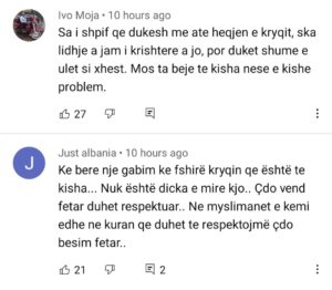 “Ke bërë gabim ke fshirë kryqin që është te kisha… Nuk është diçka e mirë kjo. Çdo vend fetar duhet repsektuar… në myslimanët e kemi dhe në kuran që duhet të respektojmë çdo besim fetar”, shkruan dikush tjetër në Youtube.