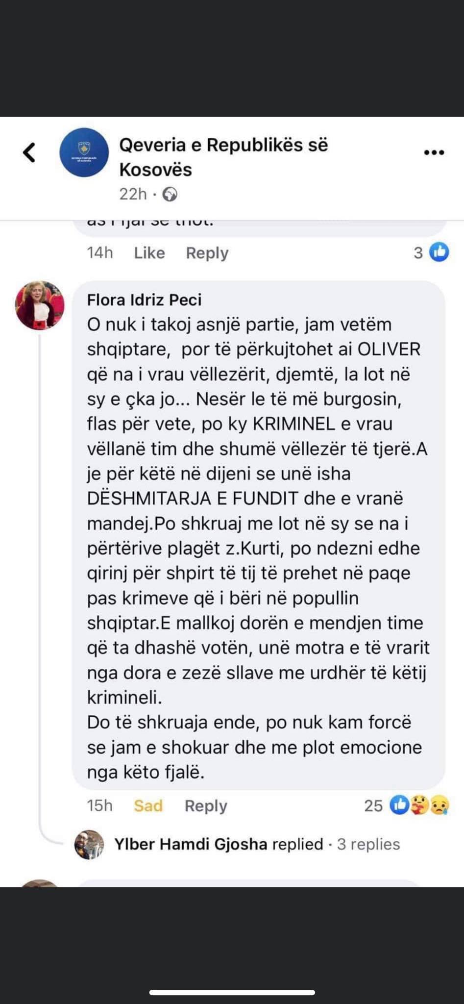 Në profilin zyrtar në facebook të Qeverisë së Kosovës, ka reaguar Flora Peci të cilës grupi i Ivanoviqit ia kishte vrarë vëllain.