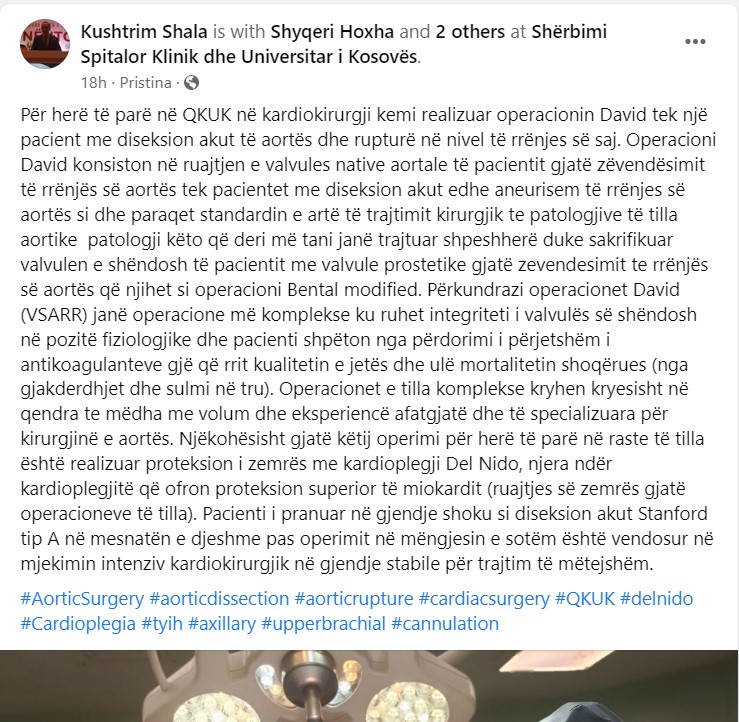 Kardiokirurgu Kushtrim Shala ka dal me një postim publik para 18 orësh në profilin e tij në Facebook, ku ka pretenduar se ka kryer me sukses një operacion të rrallë tek një pacient me diseksion akut të aortës. Në fakt operacioni nuk dihet nëse ka pasur sukses, sepse pacienti ka vdekur pas disa orësh.
