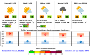 Temperaturat minimale do të lëvizin ndërmjet 14-16 gradë Celsius, ndërsa maksimalet e ditës parashihen të lëvizin ndërmjet 28-31 gradë Celsius. Do të fryjë erë nga veriu me shpejtësi 1-6m/s.