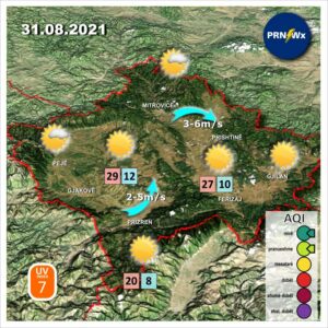 “31.08.2021 – Kryesisht me diell dhe më ngrohtë. Temperaturat në vise të ulëta luhaten nga 10C deri 29C, e në vise malore nga 8C deri 20C. Do të fryjë erë e lehtë dhe mesatare nga jugperëndimi e perëndimi 2-6m/s. Indeksi UV i lartë, ndaj orëve të mesditës preferohet të kufizojmë qëndrimin në diell. Indeksi i cilësisë së ajrit në vlera të mira dhe të pranueshme.