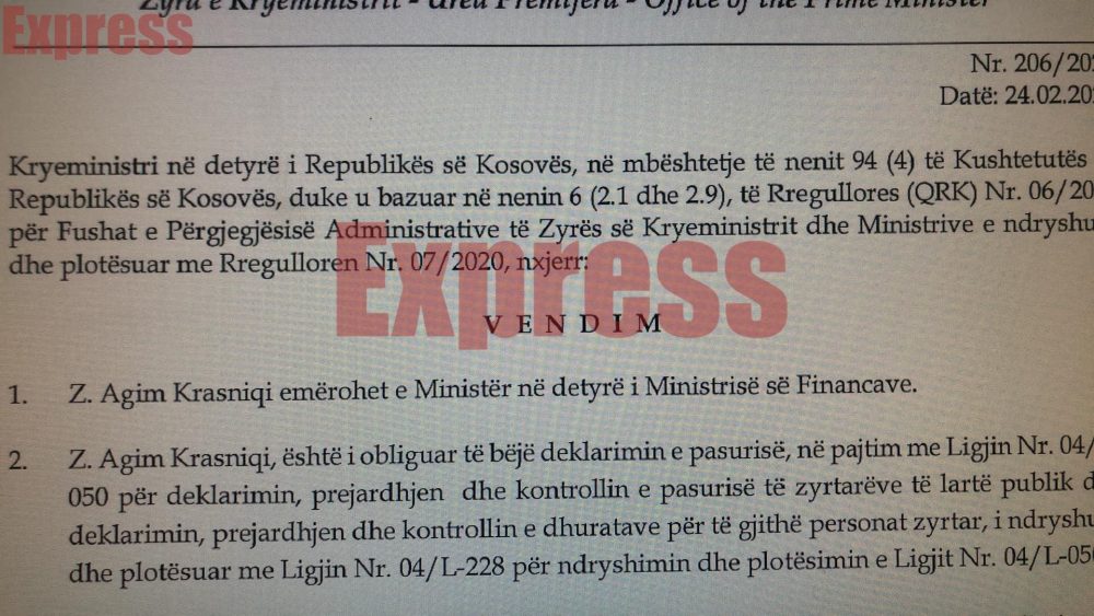 Express ka siguruar vendimin e Qeverisë ku thuhet se Krasniqi është emëruar Ministër në detyrë i Ministrisë së Financave.