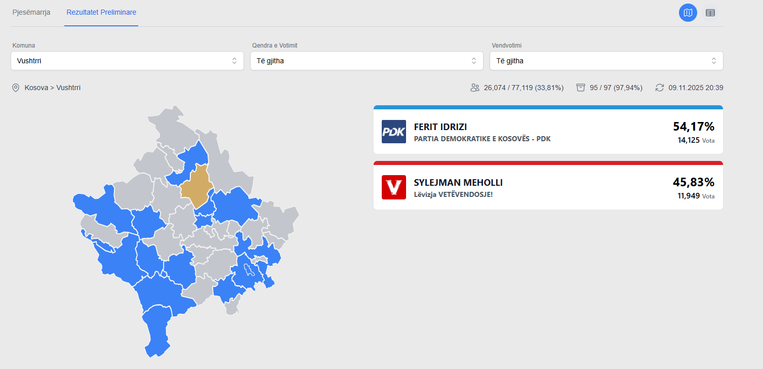 Kandidati i Partisë Demokratike të Kosovës, Ferit Idrizi, pothuajse ka siguruar fitoren në komunën e Vushtrrisë pas një gare të fortë me kandidatin e Lëvizjes Vetëvendosje (VV), Sylejman Meholli.