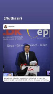 Së fundi, përmes një postimi në rrjetet sociale ka përkrahur tani publikisht kryetarin e komunës së Gjilanit, Lutfi Hazirin, në garën për kryetar të partisë.