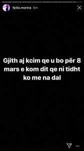 Bëhet fjalë për Fjolla Morinën, e cila pëmres një shkrimi në Instagram ka thënë se kcimi që është bërë për festën e marsit, patjetër që diku është dashur të dal hidhërim. “Gjith aj kcim për 8 mars, e kom ditë që tidht ko me na dal”, ka shkruar këngëtarja.