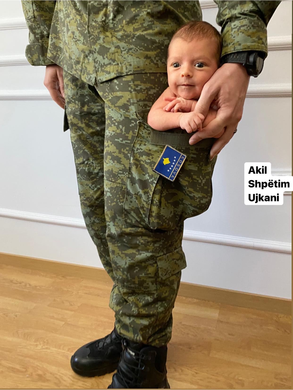 Gjatë ditës së sotme fotografia e Akilit – njëmuajsh në xhepin e uniformës ushtarake të babait të tij, u bë virale në Kosovë.