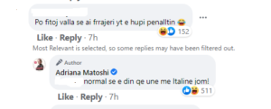 E pikërisht në këtë shkrim të sajin, të njëjtës iu është bërë një koment, por, që Matoshi e ka marrë siç duket me sportivitet.