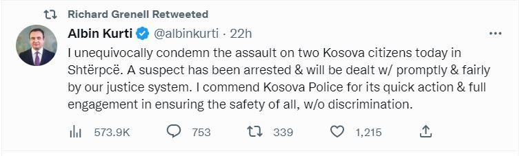 Ish i dërguari special i ish-presidentit amerikan Donald Trump, për dialogun Kosovë-Serbi, Richard Grenell ka shpërndarë postimin e kryeministrit të Kosovës Albin Kurti, në të cilin dënonte plagosjen e dy të rinjve në Shtërpcë.
