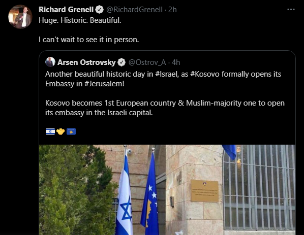 Ish-I Dërguari Special i SHBA’së për Dialogun Kosovë-Serbi, Richard Grenell, e ka quajtur historike hapjen e ambasadës së Republikës së Kosovës në Jerusalem.