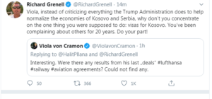 “Viola, në vend që të kritikoni gjithçka që Administrata Trump bën për të ndihmuar në normalizimin e ekonomive të Kosovës dhe Serbisë, pse nuk përqendroheni në të vetmen gjë që ju është dashur të bëni: vizat për Kosovën. Ju jeni duke u ankuar për të tjerët qe 20 vjet. Bëni pjesën tuaj!”, i ka shkruar Grenell raportueses së Parlamentit Evropian, e cila kishte shkruar “Interesante. A kishte ndonjë rezultat nga “marrëveshjet” e tij të fundit”, duke iu referuar Administratës Trump.