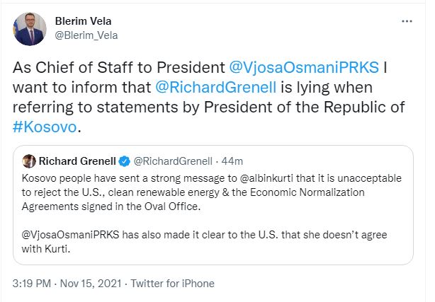 “Si shef i kabinetit të presidentes Vjosa Osmani unë dua të informoj se Richard Grenell po gënjen kur i referohet deklaratave të Presidentit të Republikës së Kosovës”, shkroi Vela në Twitter.