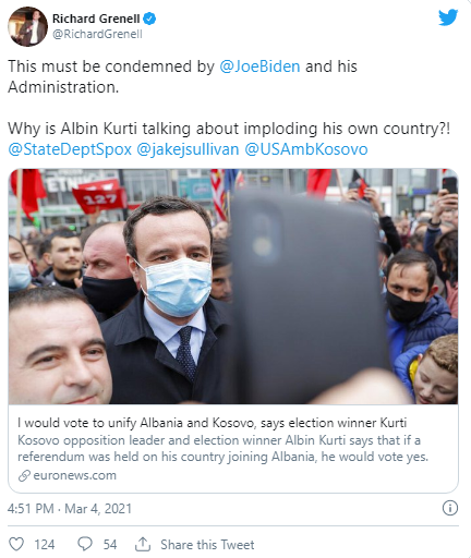 Ish-Emisari i Presidentit Donald Trump, Richard Grenell ka kërkuar nga administrata e Joe Biden që të dënojë deklaratat e Albin Kurtit për bashkim me Shqipërinë.