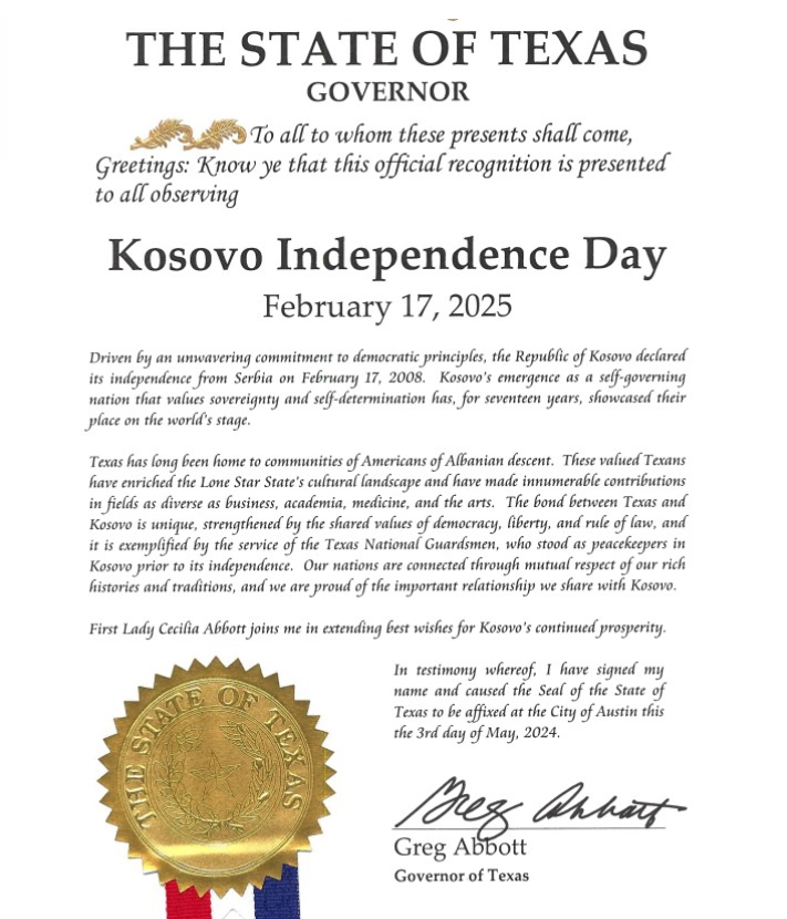 Guvernatori i Teksasit, Greg Abbott, ka uruar Republikën e Kosovës për 17-vejtorin e shpalljes se pavarësisë.