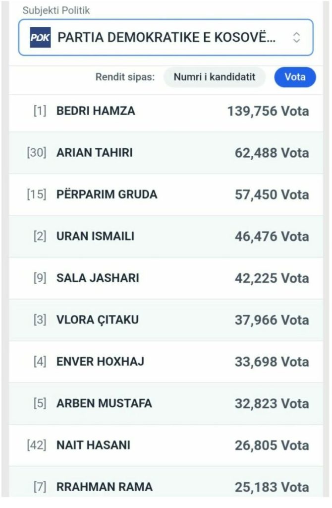 Sipas rezultateve të KQZ-së, në PDK më së shumti vota ka Bedri Hamza 139,642.