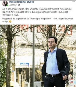 Meliza Haradinaj, këshilltare e ish kryeministrit, Ramush Haradinaj, përmes një postimi të bërë në Facebook ka thënë se xhinset që kryeministri Kurti ka veshur janë të markës “Diesel”, ndërsa kushtojnë 130 euro.