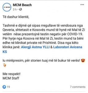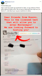 ‘Aparatments Secret Garden Ulcinj’ ka publikuar një raport nga klinika ‘Ylli’ ku aty shihet se personi ka rezultuar negativ. Në postimin e tyre shkruhet se me anë të këtij raporti nga kjo klinikë, qytetarët nga Kosova mund të hyjnë pa problem në Malin e Zi.