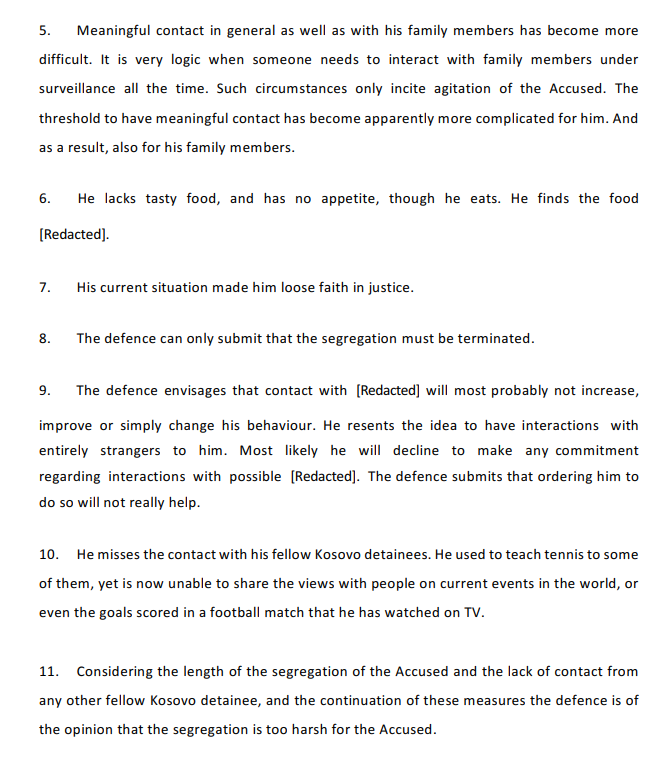 “Duke marrë parasysh kohëzgjatjen e ndarjes së të akuzuarve dhe mungesën e kontaktit me ndonjë bashkëkombës tjetër të paraburgosur nga Kosova, dhe vazhdimin e këtyre masave, mbrojtja mendon se ndarja është shumë e ashpër për të akuzuarin”, përfundonte parashtrimi.