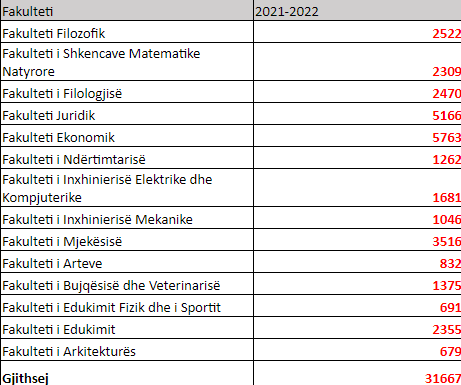 Sipas të dhënave zyrtare të Universitetit të Prishtinës, në vitin akademik 2021/22 në Universitetin e Prishtinës janë 31667 studentë, shkruan lajmi.net.