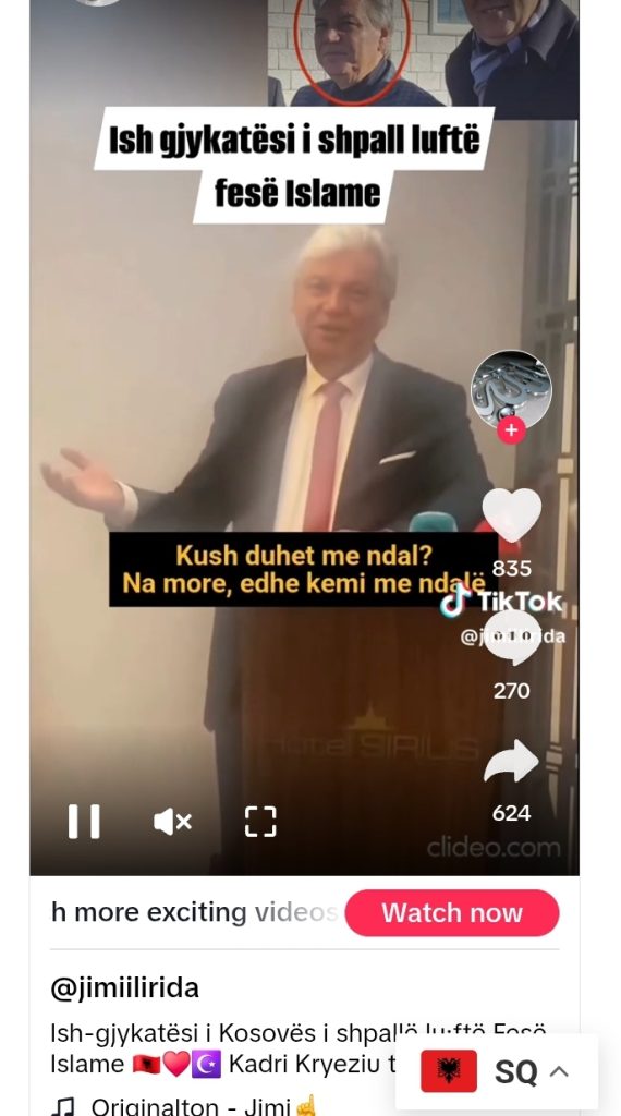 “Feja Islame në Kosovë ka dal nga shtrati, ka vërshu nga shtrati. Kush duhet me ndal? Na more, edhe kemi me ndalë. Ka shumë të interesuar në këtë punë. Ani pse është vetëm një shoqatë, këta janë nismetarë, unë e respektoj shumë si ide”, dëgjohet duke thënë ai.
