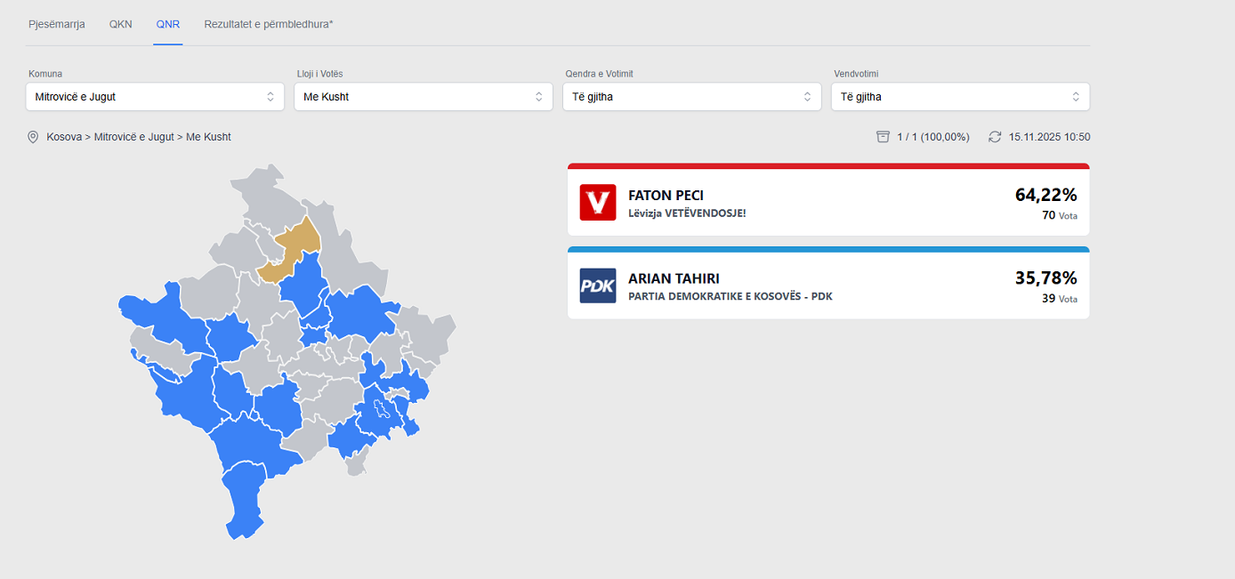 Në faqen e Komisionit Qendror të Zgjedhje tashmë janë publikuar rezultatet e numërimit të votave me kusht dhe të atyre të personave me nevoja të veçanta për balotazhin e 9 nëntorit në komunën e Mitrovicës së Jugut.