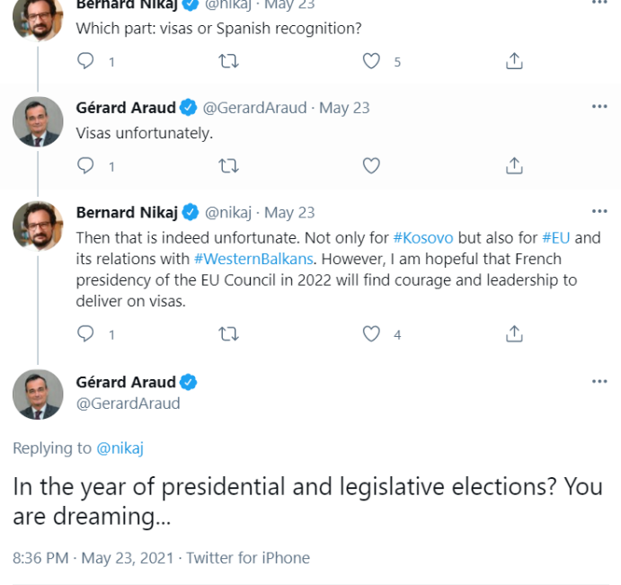 Nikaj në shkrimin e tij ka thënë se shpreson që Franca gjatë vitit 2022, do t’i heqë vizat për qytetarët kosovarë, mirëpo Araud i ka thënë se “po ëndërron”, duke ia bërë me dije se kjo nuk do të nodhë.